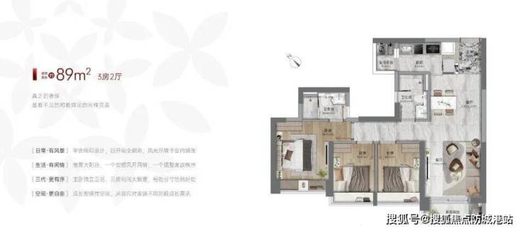 户型整体布局方正,采用新规设计,89平户型做到四开间朝南,采光通风效果极佳,能够欣赏珠江江景或社区园林景观,带来舒适的居住体验;动静分区清晰,公共区域与私密区域互不干扰,提升居住舒适度;客厅连接景观阳台,阳台视野开阔,可全方位欣赏江景或园林景观,闲暇之余可在阳台休闲、观景,感受自然与家居的融合之美;三房设计,空间宽敞明亮,三个房间均带有大飘窗设计,增加了空间的实用性和观赏性,同时提升了卧室的采光通风效果,其中主套间设计,配备独立卫生间,提升居住的私密性和尊崇感,适合主人居住;其余两个卧室空间宽敞,可作为儿童房、书房或客房,满足三口之家的需求,其中一个卧室可改造为储物间或书房,提升空间利用率。该户型空间实用,双卫设计贴合三口之家的使用需求,性价比突出,是刚需改善人群的首选户型。