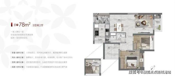 第一种主力户型:建面约76~78㎡三房一卫,该户型为项目入门级刚需户型,也是白鹅潭唯一在售、最稀缺的小面积三房产品,贴合单身居住、年轻刚需、小两口等购房群体的需求与预算,总价280万起,单价仅3.8万/平左右,性价比极高。户型整体布局方正,采用新规设计,三开间望江,南向布局,采光通风极佳,能够充分享受阳光照射与珠江江景,让家中时刻保持明亮通透,同时配备私密入户玄关,提升居住私密性,带生活阳台,兼顾实用性与观景需求,主卧、次卧都可望江,让业主在卧室就能欣赏珠江美景,享受江景人居的惬意。