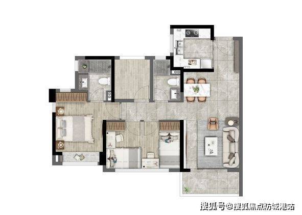 B 户型实现了 89 平享四房的创举,是全家庭自由成长户型的典范。同等面积下多一房的设计,为家庭未来的成长预留了充足空间,满足了不同阶段家庭结构变化的需求。四开间朝南,使得家中每一处空间都能充分享受阳光与清风,通风采光条件优越。主卧套房设计,配备独立卫生间和明亮飘窗,不仅保障了主人的私密性,还能带来舒适的居住体验,满足全功能需求。创意百变双孩房更是一大亮点,空间灵活可变,随时满足二胎家庭的需求,为孩子提供舒适的成长环境。
