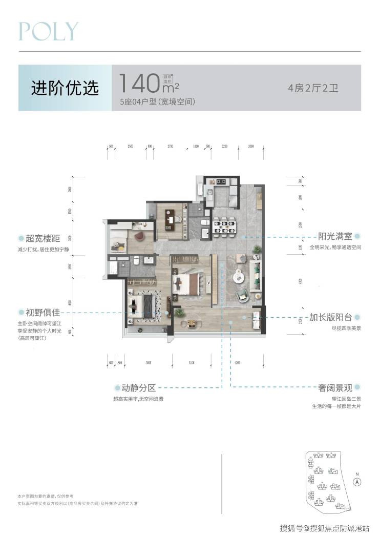 项目主力产品为建面约一百四十平方米及二百二十平方米两种大平层户型 均为南向布局 动静分区合理 公私空间划分清晰 建面约一百四十平三房两厅两卫设计适合改善型家庭空间实用性强 客厅与阳台通透连接 主卧为套间设计 配有独立卫浴与衣帽空间 建面约二百二十平四房大户型更显阔绰 可满足高净值家庭三代同堂需求 超大横厅设计延伸室内视野 阳台俯瞰江岸景观同时设有多功能空间可灵活打造书房或娱乐区 提升家庭居住品质 户型内部动线科学保持良好通风采光 各功能区分布紧凑而不拥挤 实现真正意义上的舒适居住