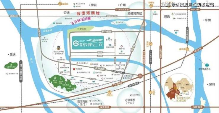 项目位于佛山、江门、中山核心区位几何中心,15分钟到中山、江门,3站约 40分钟到广州,60分钟到东莞/深圳。