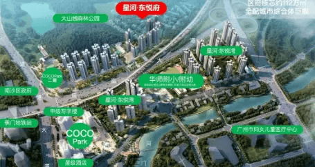 蕉门河两岸聚集了南沙区政府、图书馆、体育馆等60%的政务资源,星河东悦府位于板块几何中心,步行10分钟可达: