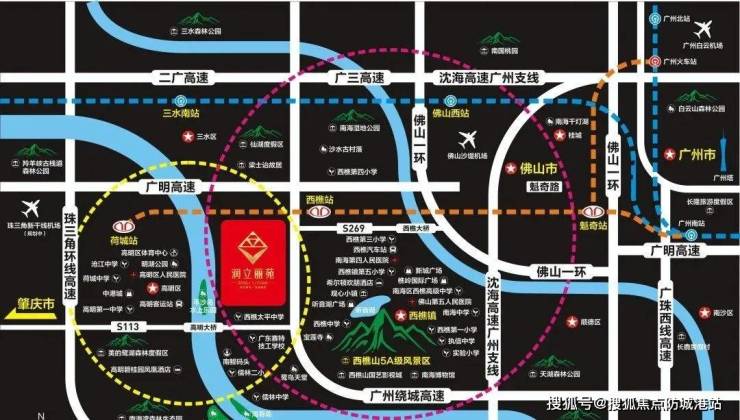 (5)交通配套:5分钟内可上广州环城高速,10分钟上广明高速,约20分钟车程可直到南庄禅城、丹灶,高明,30分钟内可直达狮山、罗村、桂城,约40分钟可直达广州、江门等,项目门口有906、212公交站可直达到西樵和山水城