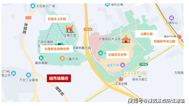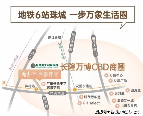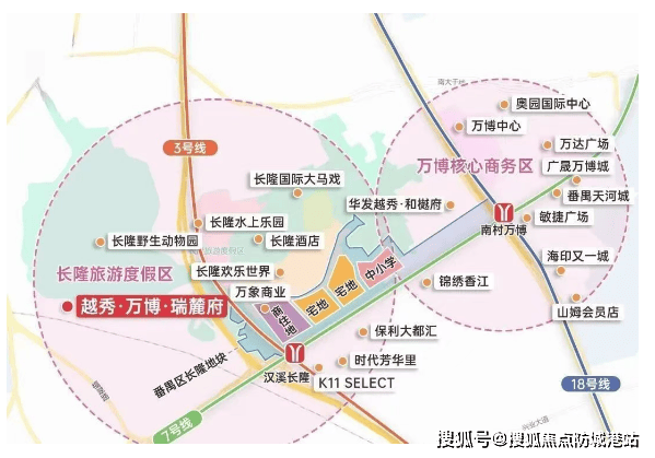 越秀·万博瑞麓府紧邻长隆野生动物世界西南侧,西侧临钟顺路,距离万博CBD核心区直线约5公里,驾车10分钟即可抵达。2023年,万博片区迎来历史性升级——由原1.5平方公里扩容至7.2平方公里,正式更名为“长隆万博CBD”,规模一举超越珠江新城(6.19平方公里),成为广州南拓战略的核心引擎。这一扩容不仅整合了长隆世界级文旅IP与万博总部经济区,更形成“北有天河北,南有长隆万博”的双核格局。瑞麓府恰好位于这一超级CBD的辐射腹地,左手是年接待超千万游客的长隆度假区,右手是汇聚众多企业总部、高端商业与金融资源的商务高地,真正实现“出则繁华,入则宁静”的理想生活范式。