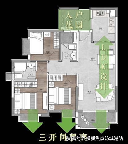 采光通风一流;户型方正实用,私家入户花园,L 型厨房动线,实用性拉满。