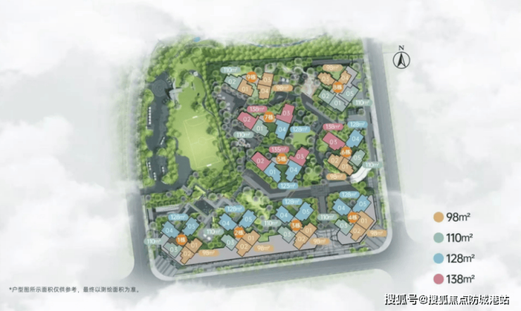 三期组团楼栋全南向排布,户型设计合理,使用率高达98%以上,部分户型甚至达到100%。不同面积段的户型(98-110-128㎡)适应不同家庭结构的需求,均采用新规设计,强调舒适度和实用性。
