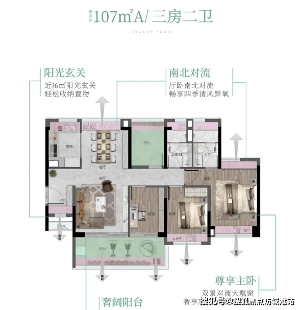 在产品力方面,越秀大学星汇城的户型设计堪称“空间魔术师”,极致追求实用率与舒适度。86平方米户型做到了罕见的“2+1房”且全开间南向,三卧室朝南,拥有超11米的景观面,全屋高赠送使得使用率超过90%,收纳空间充足,非常适合年轻夫妇或三口之家。107平方米户型分为A、B两款,均实现了“3+1房”布局,其中B款更是做到了五开间朝南,客厅与主卧双南北对流,搭配约6米的大阳台和独立玄关,既保证了私密性又提升了通风采光效果,全屋赠送面积约20平方米。125平方米户型则升级为“4+1房”,五开间朝南,LDKG大方厅设计让空间更加灵动,可变的多一房满足了二胎家庭或三代同堂的多样化需求。所有户型均采用全南向布局,最大化利用自然资源,真正实现了“小而精、大而舒”的居住理想。