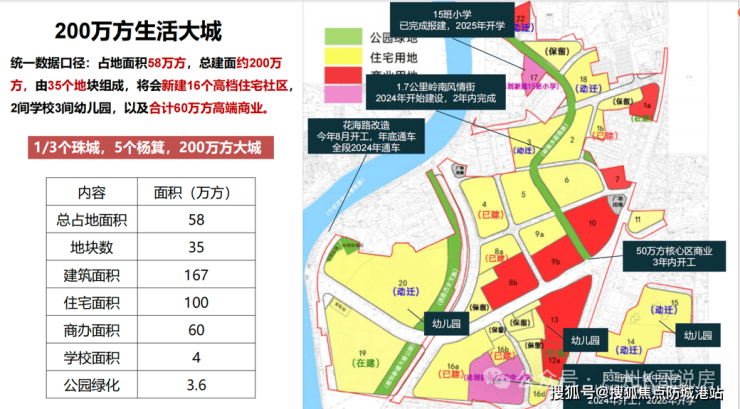 诚汇新都整体项目涵盖 35 个地块,占地约 54 万㎡,总建筑面积超 200 万㎡,是广州主城罕见的大规模连片开发城市更新项目,规划打造 16 个高端住宅社区、2 所学校、3 所幼儿园及 60 万㎡高端商业,内部构建 “一心三脉” 四大组团,未来将成为集总部办公、高端商业、生态人居于一体的都会生活 3.0 大城。