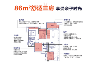 86㎡三房两卫:约3.9米客厅开间、主卧转角飘窗、宽景阳台,兼顾舒适与私密;