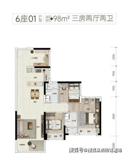 约98平方米的3+1房2厅2卫1阳台:灵活的“+1”空间可根据家庭需求进行改造,适合不同阶段的家庭使用。