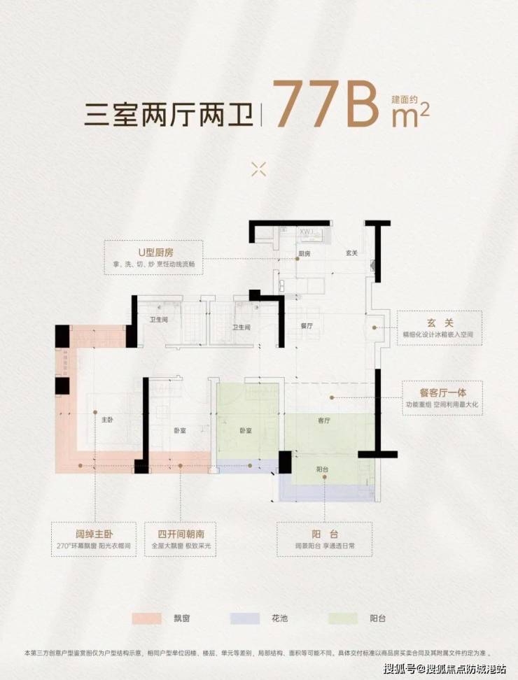 77㎡三房:总价190万起,东南朝向+L型全景飘窗,阳台占比20%。