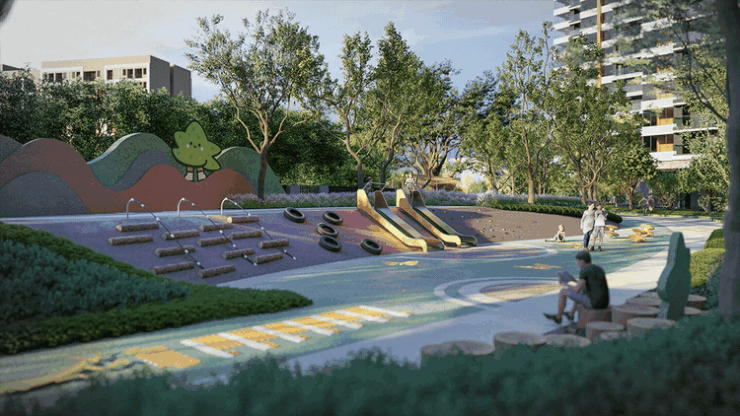 答: 项目内部规划了约1.2万平方米体育公园及全龄段儿童游乐设施,包括互动景观墙、树屋、迷你篮球场等,功能丰富且安全。