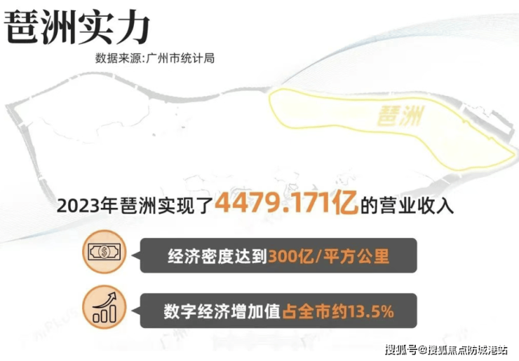 2. 珑璟台所处的琶洲区域,是湾区创新政策的重要发源地与产城融合的全新标杆。琶洲约14.9平方公里的土地上,聚集了超45家高新技术企业、80家省级专精特新企业、98家总部企业,腾讯、阿里巴巴、唯品会等互联网巨头纷纷在此落地扎根。2023年,琶洲实现了4479.171亿的营业收入,经济密度达到300亿/平方公里,其数字经济增加值更占全市的13.5%。