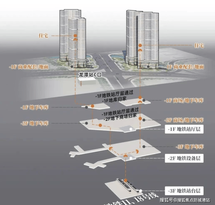 9. 珑璟台是广州地铁地产践行TOD发展理念的典范之作,虽非传统意义上的【区府+TOD】双核心联动发展模式,但以其独特的TOD模式引领区域发展。项目作为广州地铁“TOD立体都会设计”的4.0版本,依托地铁11号线和18号线龙潭站,实现了交通与城市功能的高度融合。