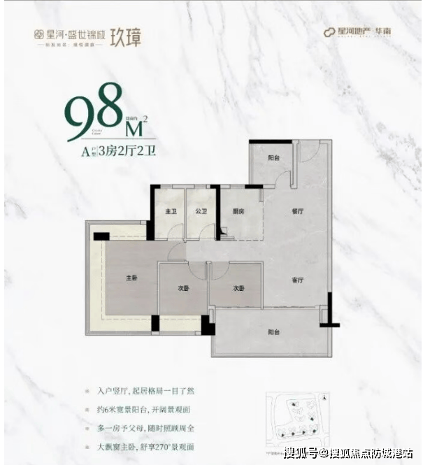 98㎡户型是其中的“爆款”之作。主朝向朝南,主卧配备270°无柱飘窗,视野开阔,景色尽收眼底。次卧和阳台的尺度大幅增加,提供了更加舒适的居住体验。无论是休闲娱乐还是晾晒衣物,都显得更加从容。客厅与餐厅的连通设计,使得空间感倍增,即便是在较小的面积内,也能营造出宽敞大气的效果。