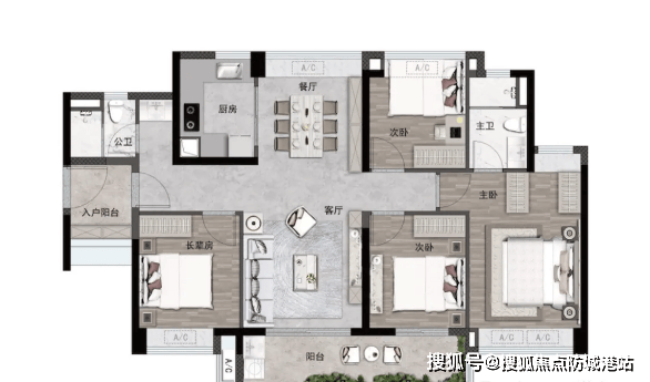 105-115㎡三房:得房率 98%,均为横厅设计,105㎡客厅面宽 6 米,115㎡客厅面宽 6.2 米,搭配 5.5 米面宽景观阳台(连接次卧),全屋 7-8 处飘窗赠送(含主卧 2 处转角飘窗)。横厅设计让公区更开阔,适合多孩家庭 “一步到位”,主卧套房带独立卫浴与大面宽飘窗,居住体感对标改善型产品。