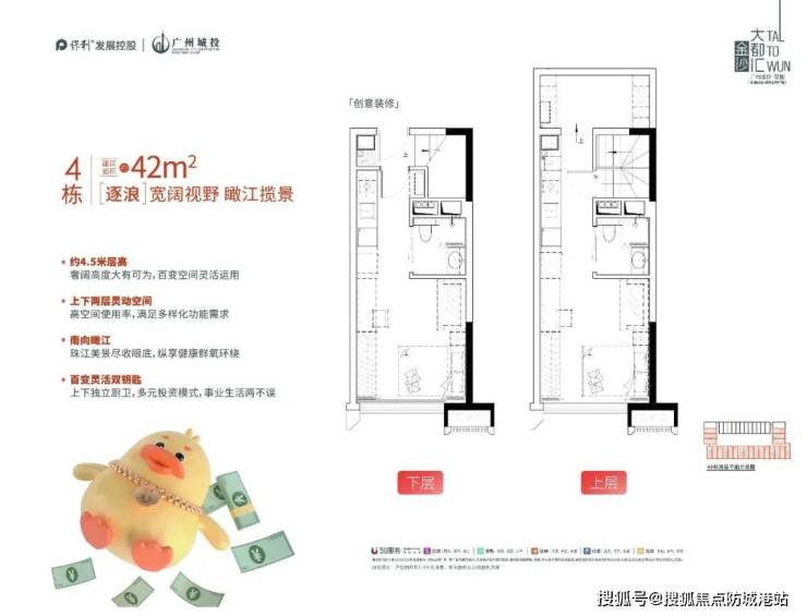 项目主推建面约30至42㎡复式产品,层高约4.5米,空间感极强,设计灵动百变。上下两层可独立分隔,实行双钥匙管理,买一得二,既可自住,又可分租,最大化实现空间与收益的平衡。无论是单身精英、创业人士,还是投资客,都能在这里找到合适的选择。户型设计强调实用与美学结合,南向采光充足,布局合理,功能齐备。这样的空间规划,既体现了现代都市生活的多元需求,也提升了产品的长久竞争力。