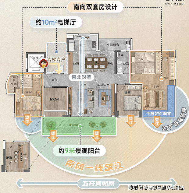 全南向瞰江布局:配备超长阳台、U型厨房、超大主套、270°景观飘窗、标配衣帽间等。