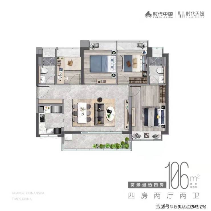 106㎡四房两卫:横厅布局,面宽6.8米,连接270°环幕飘窗,采光面超15㎡,适合二胎家庭或三代同堂。