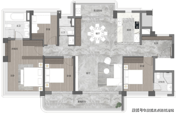 140㎡四房三卫:横厅设计,餐客厅一体化连接7.5米观景阳台,形成通透对流空间;四个卧室分列两侧,互不干扰;主卧套房带步入式衣帽间+双台盆卫浴,提升居住品质。