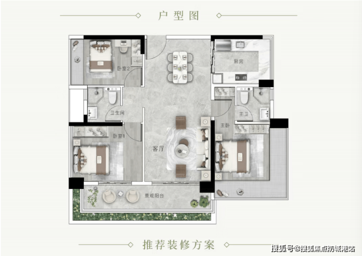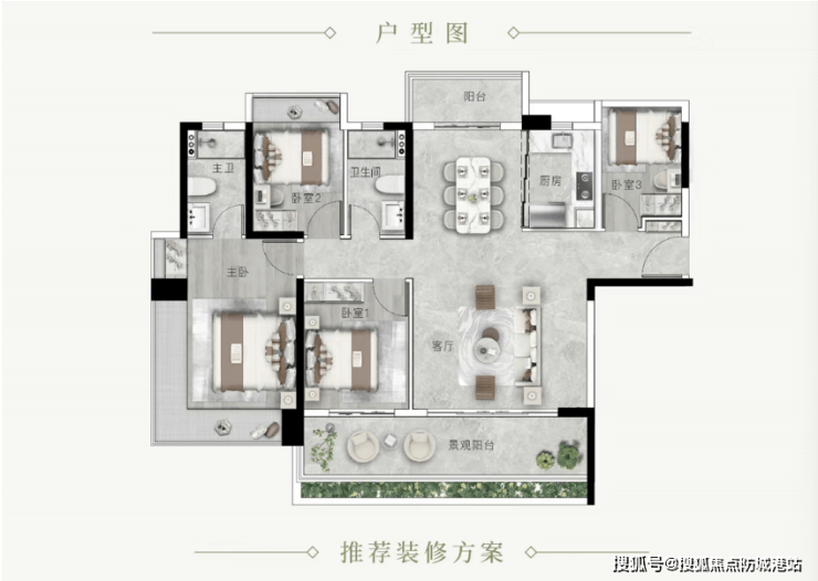 亮点:主卧套间(270° 飘窗)、次卧带全景飘窗、客厅连通 6.8 米超大阳台、入户玄关收纳、厨房 U 型设计