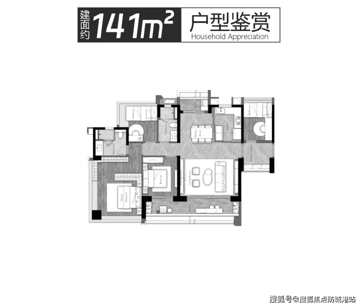建面约125㎡户型为3房+2厅2卫+灵动空间,全明4开间朝南,约12.8米大面宽带来极致舒居体验,IMAX大方厅搭配LDK一体化设计,提升空间通透感与实用性,全屋科学收纳系统有效利用每一处空间,实用率表现出色。建面约141㎡户型则主打景观优势,约14.6米IMAX采光视野搭配8.2米景观大阳台,尽揽滨水美景,主卧端厅设计实现270°全景采光,彰显高端居住格调。