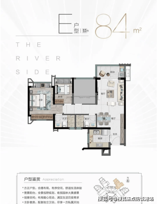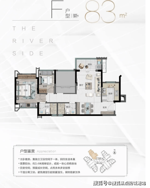 建面约83-84㎡三房户型,在81㎡户型的基础上,优化了空间布局,客厅和卧室空间更宽敞,舒适度更高,同样采用全南向设计,采光通风效果出色;客厅阳台更宽敞,可兼顾休闲和晾晒需求,闲暇时可在阳台喝茶、看书、观景,享受惬意时光;卧室均配备飘窗,增加使用空间,提升居住体验;厨房和卫生间布局合理,实用性强,适合三口之家居住,既能满足日常居住需求,又不会造成空间浪费。