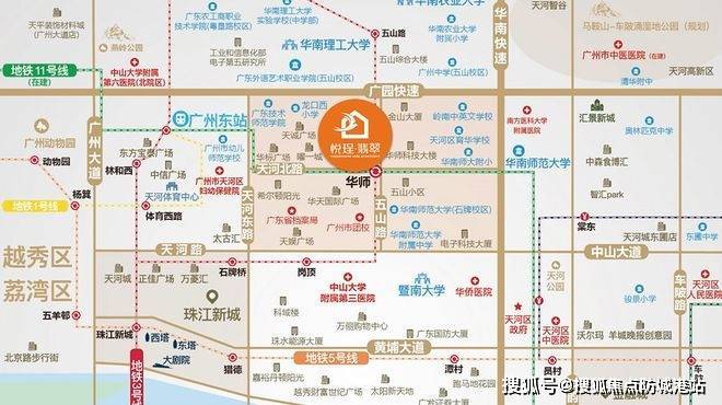 交通方面,悦珵·翡翠享受三地铁交汇的便利,广州地铁3号线、10号线和11号线在这里汇聚,最近的华师站仅步行约300米。乘坐地铁两站就能抵达广州东站,四站直达珠江新城,五站到广州塔,日常通勤或者周末出行都非常高效。从项目到广州东站开车仅约3公里,15分钟左右就能上高铁,一小时内轻松连接大湾区其他核心城市。周边300米内有龙口西路站、翰景路站、师大后门站、五山路站四个公交站点,覆盖超过20条公交线路,路网发达。广园快速和华南快速也在附近,驾车出行同样顺畅。