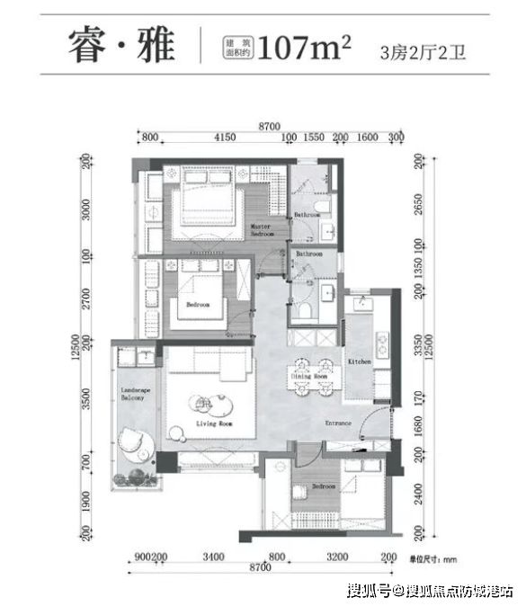 其中,建面约107㎡三房两厅两卫户型,西向布局,单价约8.5万-9万,总价约900万-960万,适合三口之家居住。该户型布局紧凑合理,客厅宽敞明亮,连接观景阳台,既能保证充足的采光,又能欣赏窗外的美景;三个卧室均朝南或朝西,采光充足,空间舒适,主卧配备独立卫生间,保障了业主的私密性;厨房采用L型设计,操作空间充足,动线合理,方便日常烹饪;卫生间干湿分离,干净整洁,提升了居住的舒适度。