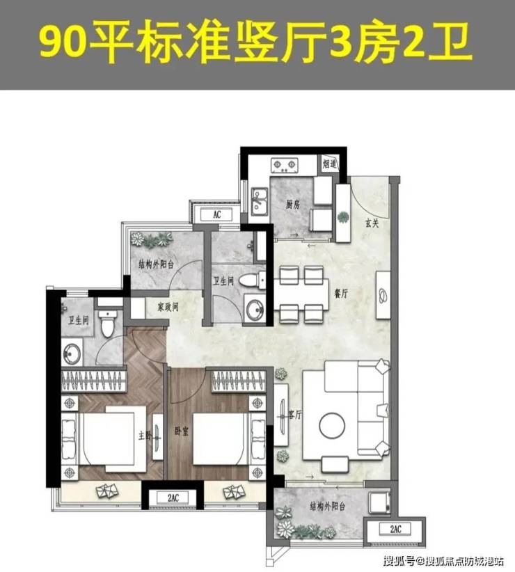 每一栋都是2梯4户设计,居住舒适度是比较高的,但反之得房率就比较一般,90平做了标准的三房设计,很标准和平凡的户型,对比马鞍岛上的楼盘,这个三房设计算第二档次。