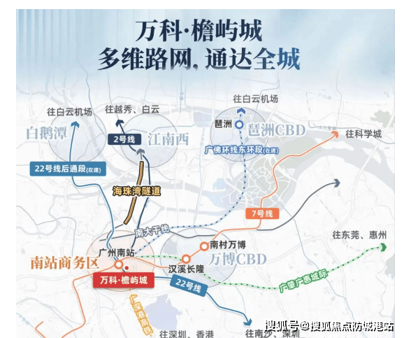 万科檐屿城地理位置优越,周边交通网络发达,拥有四条地铁线路(2号线、7号线、22号线和广佛线),以及多条高铁线路和城际铁路,方便快捷地连接珠江新城、海珠、万博等重要区域。此外,项目靠近东晓南放射线,预计于2025年9月通车后,将进一步缩短至万博及海珠的时间成本,提升居民的出行效率。