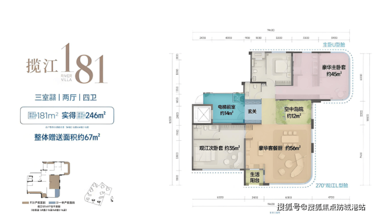 江帆郡的全景舱设计实现了空间与视野的极致突破。项目分为揽江系列和峯帆系列两个产品线。揽江系列为建面约143平方米和181平方米的户型,采用270度L型端厅配合U型主卧套房的双全景舱设计,真正实现三面观景的体验。