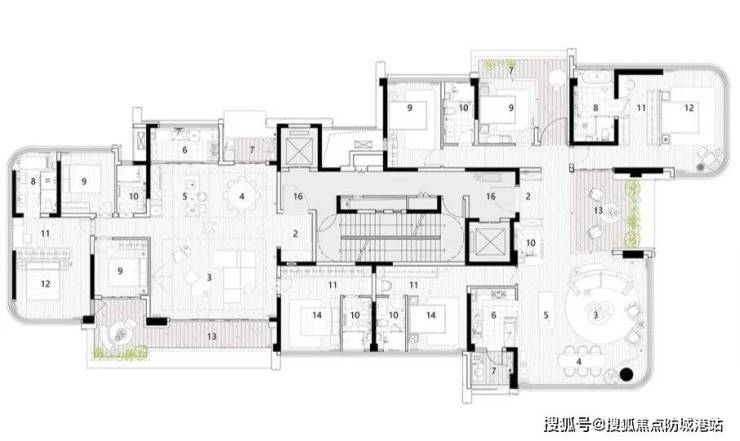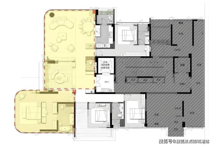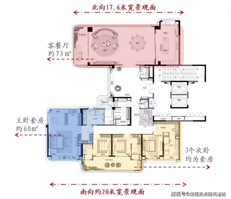 该户型被誉为豪宅户型创新的典范,几乎每个阳角的位置都做成了弧形和玻璃窗。约60㎡的主卧套房和约73㎡的客餐厅都采用的是全景舱设计。北向享受17.6米宽的景观面,南向享受约20米宽的景观面。