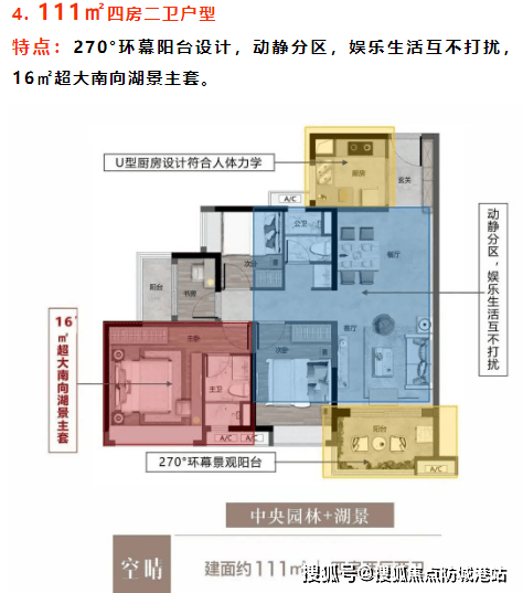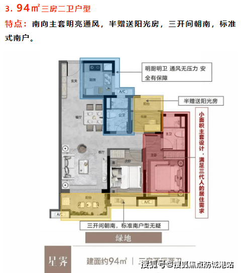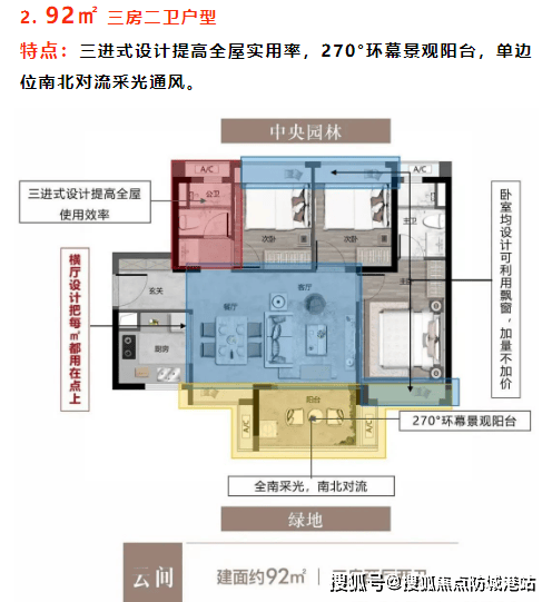92㎡三房二卫:270°环幕景观阳台,南北对流采光通风良好。