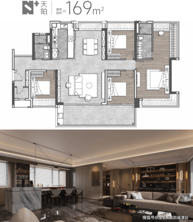 建面约169㎡户型:使用率约101%,适合大家庭居住,提供更多功能性空间。