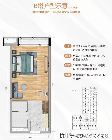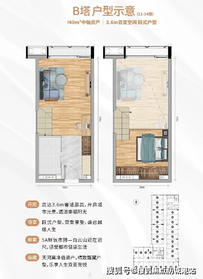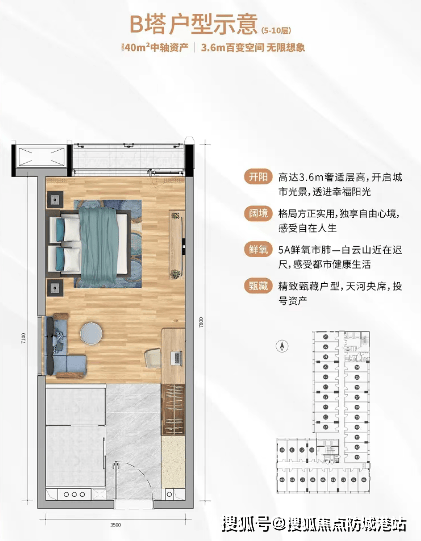 观云大厦:推售建筑面积约为36-43㎡酒店行政公馆、31-54㎡中轴精品空间,合理规划卧室、厨房、卫生间,3.4-3.6米高超高空间,满足自用、办公、投资多重需求。