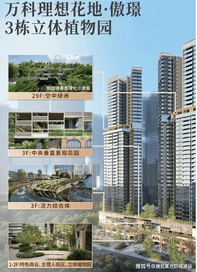 万科·理想花地·傲璟位于广州市荔湾区花地湾地铁站旁,总建筑面积约16万平方米,由4栋住宅组成,共计844套。该项目采用了高低错落的楼栋布局,功能分区明确,通过垂直森林式住宅、立体园林、空中会所等设计元素,完美解决了老城区土地资源有限的问题。同时,傲璟还致力于打造广州首座立体植物园住宅区,外立面升级为现代感十足的玻璃幕墙,彰显项目的独特性和开创性。