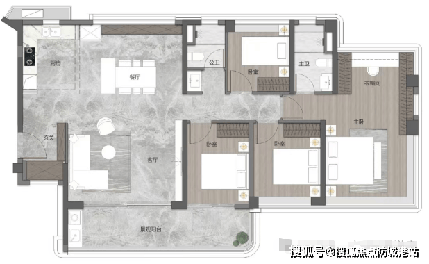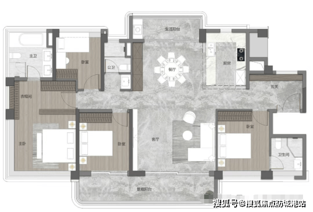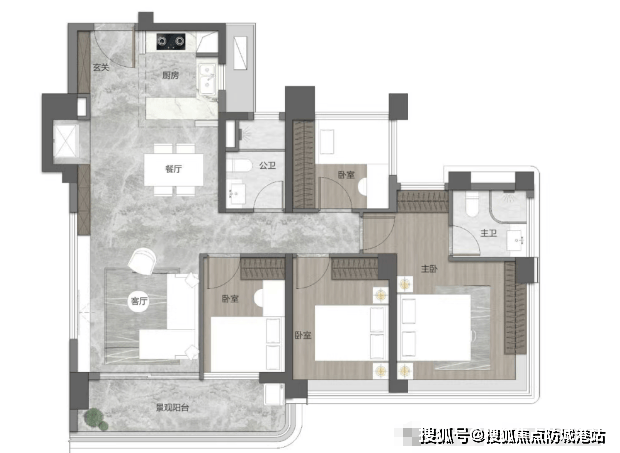 95平方米三房两厅两卫:南向三房设计,客餐厅和阳台开间达到5.6米,主卧套房设计带270度大飘窗,适合小家庭居住。