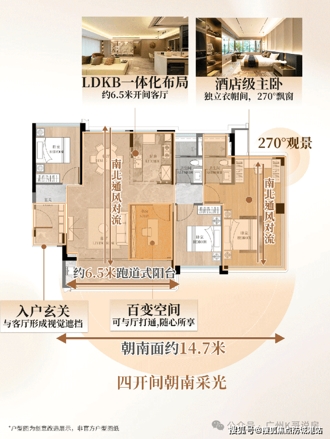 约14.7米南向面宽,餐客厅+主卧均南北通透,清风时时流连