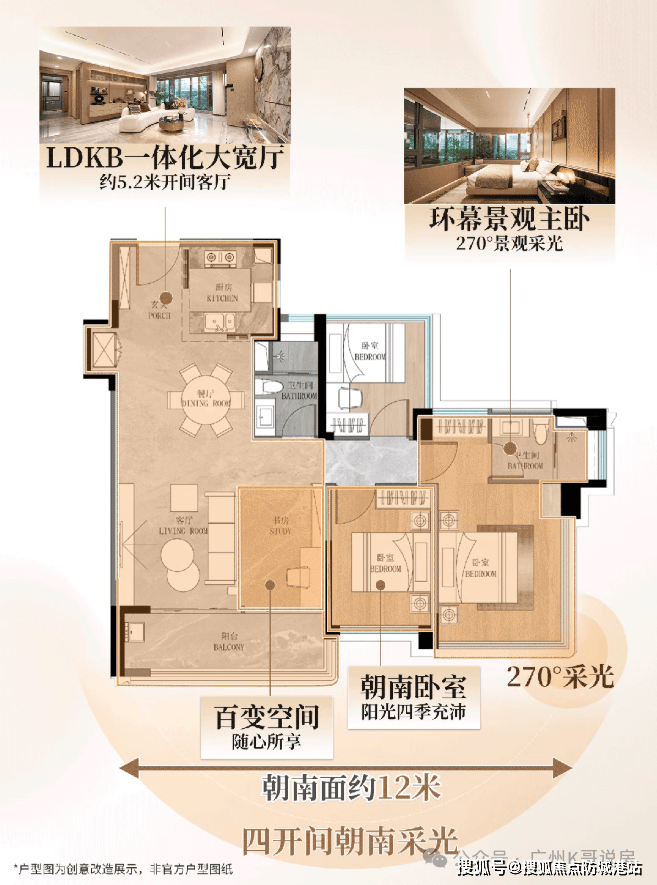 约50㎡LDKG无边界巨厅,约6.1米大面宽,连接约6.6米长南向阳台。约27㎡L型主卧套房,展开约9.2米环幕景观界面。