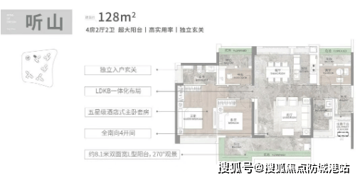 建面约128㎡(四房):设有L型独立玄关和8米L型阳台,四开间朝南,餐厅配备全景飘窗,实现完美的南北对流。