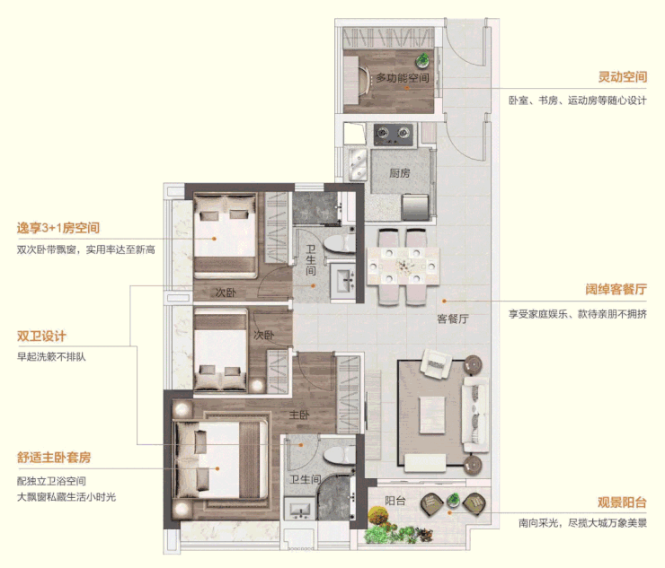 🔘三进式实用设计,望园林