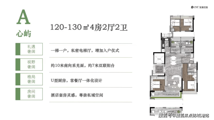 120-130㎡四房两厅两卫:约7米双联观景阳台,LDK客餐厨一体化设计,U型厨房动线合理,独梯独户保障私密性,主卧套房配备独立卫浴。