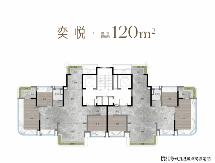 120㎡四房两卫:南向,总价920万,得房率85%;
