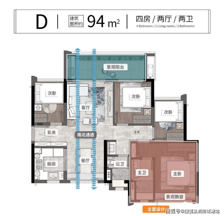 94㎡四房两厅两卫:四房格局,主卧带独立卫浴,满足二胎或三代同堂需求,总价约320万;