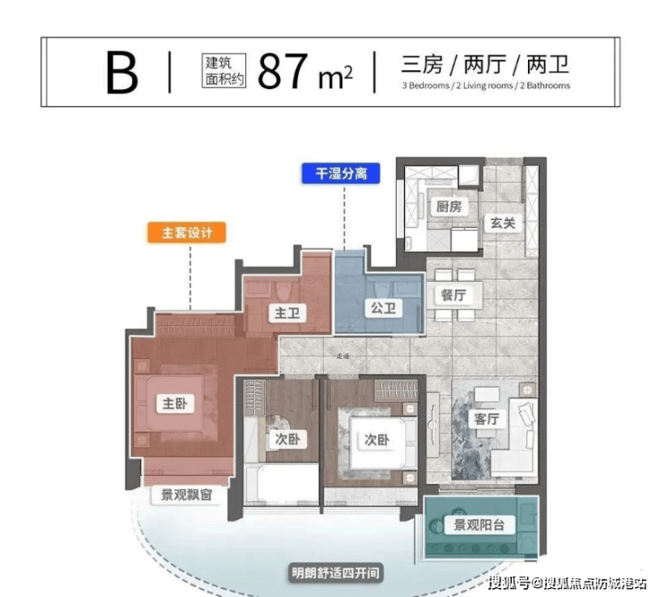 87㎡三房两厅两卫:双卫设计,餐客一体连通阳台,总价约296万起,兼顾舒适与性价比;