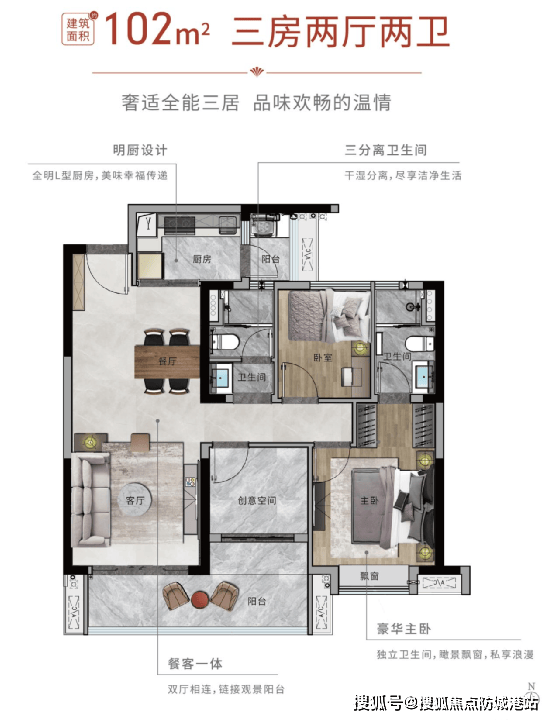 建面约102㎡ 2+1房:同样三开间朝南,配备约6.1米巨幕阳台,主卧套房设计,独立卫浴保证私密性和舒适度。