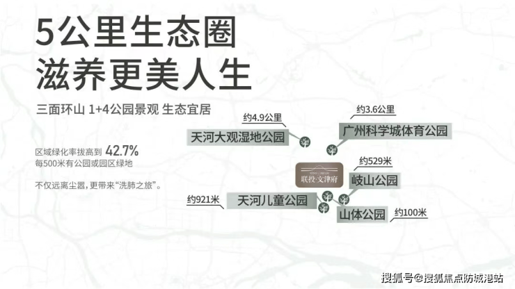 联投文津府坐落于天河智谷核心板块,周边被大灵山、长岗山、横山、简山三面环绕,拥有得天独厚的自然生态资源。项目容积率仅2.3,远低于珠江新城平均容积率5.0、区域内多数住宅项目容积率7.0的水平,是片区难得的低密社区。项目规划“一轴两心三节点六境园韵”低密奢境,以一条景观主轴串联两大中心花园、三大榕树林下空间,从岭南四大名园寻找设计灵感,打造一廊五院空间格局,用现代语言演绎轻自然的粤式共融园居生活。