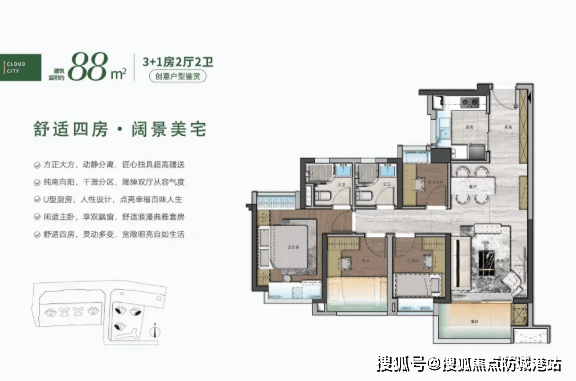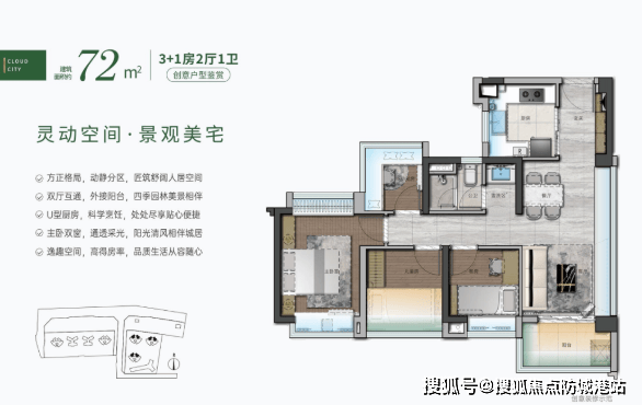 一期72㎡四房:布局紧凑而不局促,动静分区合理,适合三口之家或三代同堂过渡;