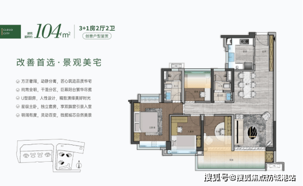 88㎡与104㎡四房两卫:主卧带独立卫浴,私密性更强,兼顾实用性与品质感;
